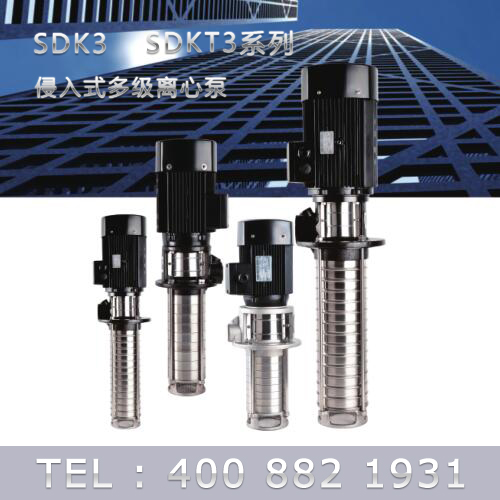 SDK3/SDKT3為配用標準電機的非自吸立式多級離心泵,電機軸和泵軸用聯軸器直接聯接的結構。為滿足水槽或容器的安裝深度,可安裝空套的腔體來改變泵本身的侵入 深度。